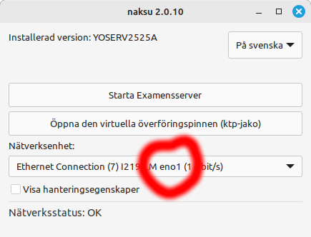 - Starta Naksu och kontrollera den valda examensnätsenhetens beteckning. Beteckningarna för kabelanslutna nätverksenheter börjar med bokstäverna en.