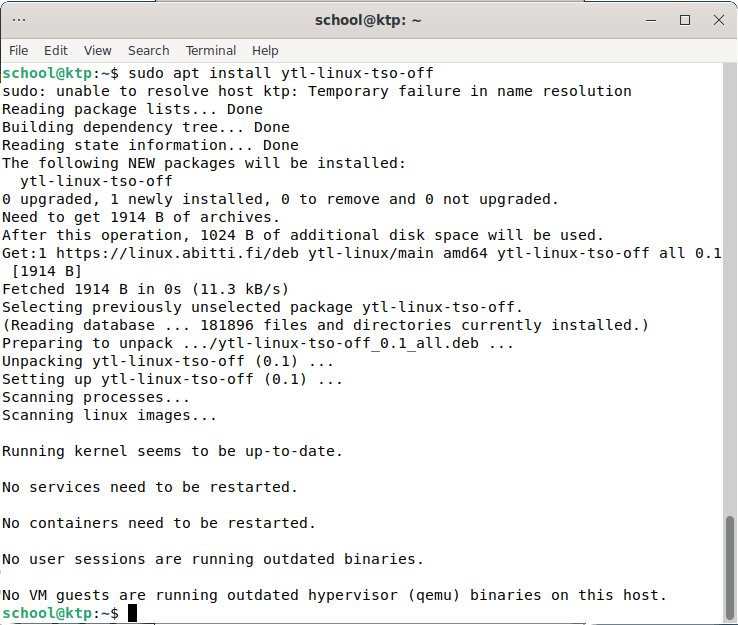 sudo apt install ytl-linux-tso-offoch tryck på enter. - Du kan bli ombedd att ange lösenordet för användaren school. Observera att du inte ser de tecken du skriver. Tryck på enter.