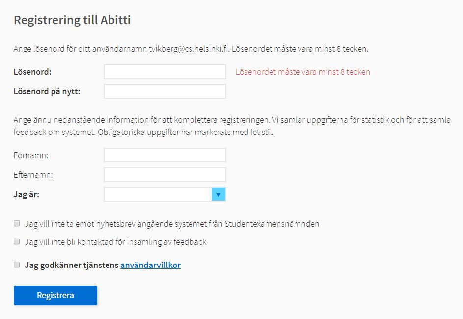 - Returlänken öppnar den egentliga registreringssidan, där du kan ange den övriga informationen och godkänna Abittis användningsvillkor. Nu är du redo att utarbeta ditt första prov!