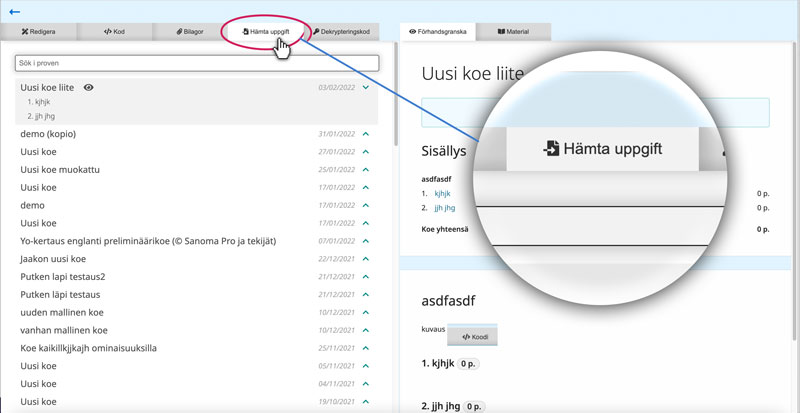 Bertta är uppdelad i två delar. Den vänstra sidan är tillägnad att skapa prov och den högra sidan visar hur prov- och materialsidorna ser ut för examinanderna.