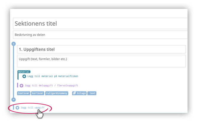 För att lägga till en uppgift, tryck på +lägg till uppgift. När du har lagt till en uppgift kan du ge den en titel och formulering om du vill. Om du lämnar rubriken tom kommer examinanden endast se uppgiftsnumret som titel.