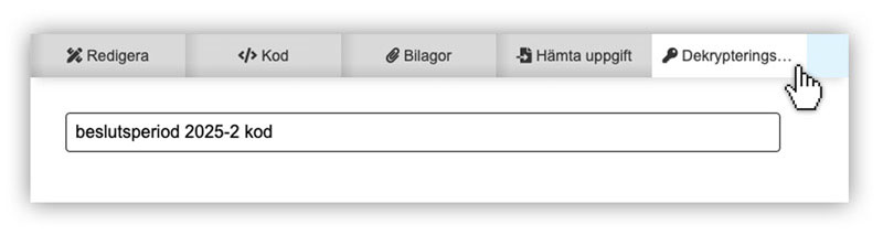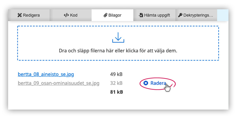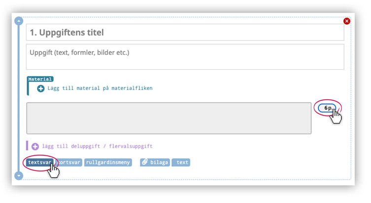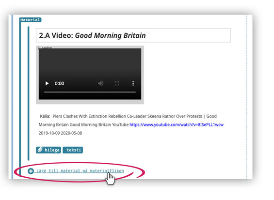 Varje uppgift har en materialsida-del där du kan lägga till material. De kan vara text eller bilagor, som pdf-, video- eller LibreOffice-filer. Materialets titel används i provet som länktext.