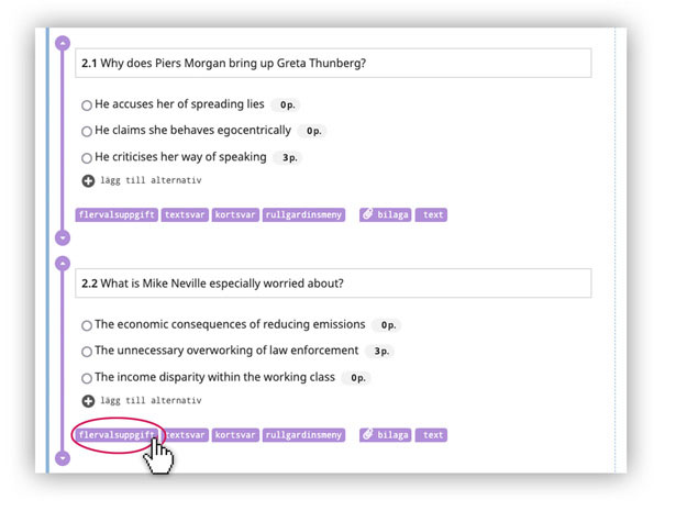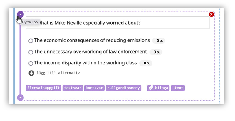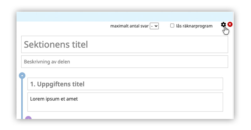 - Skapa delar av prov med valfria uppgifter. I detta fall varnas examinanden om hen svarar på för många uppgifter. Vid bedömningen kan bedömaren välja att ge noll poäng för överskridande svar.