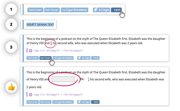 [kuvakaappaus, jossa korostettu “teksti”-painike ja näkyy ERSÄTT DENNA TEXT]
