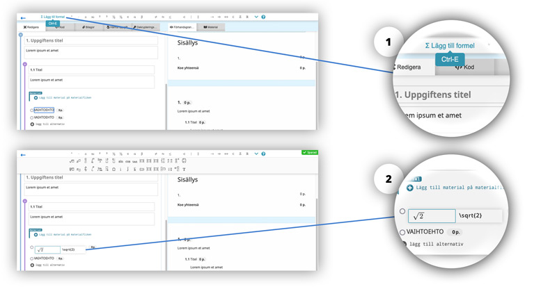 Editorn har i bruk Abittis formeleditor (Ctrl-E) för att lägga till formler till proven. Formler kan också läggas till svarsalternativen i flervals- eller flervalsluckor.